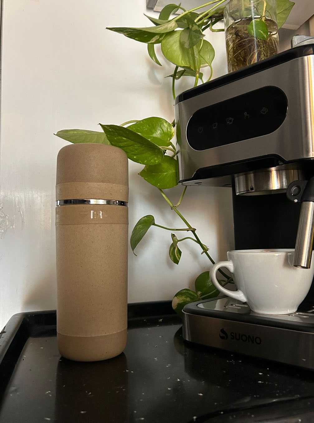 Fabricada en material polipropileno + FIBRA NATURAL DE BAMBÚ y detalles metalizados.
